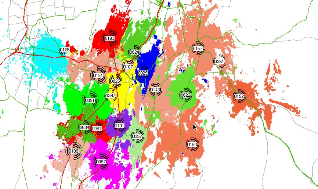 Typically, cell sites are split into “Sectors” usually there are 3 sectors, each with its own antenna, but sometimes more, sometimes less. The sectors are generally equally spaced at 120 degree intervals so as to provide service all around the mast, or building. Importantly, each of these sectors has its own unique CELL IDENTITY, which as we know is recorded within the call data records. Network engineers plan the coverage using hexagons, however, radio signals rarely propagate in this manner and we are much more likely to find an irregular coverage pattern. The actual coverage area does not provide a precise pattern, radio signals, due to their nature propagate in such a way that produces an irregular coverage area which is dependent upon many external factors such as local building clutter and topography. There is also an area of overlap between the sectors where the signals are equal in strength.