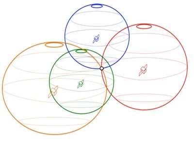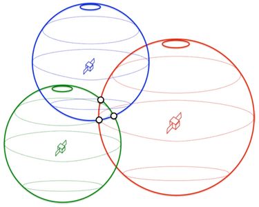 With one more satellite, you have narrowed the universe of possible intersections to just one (the single black point).