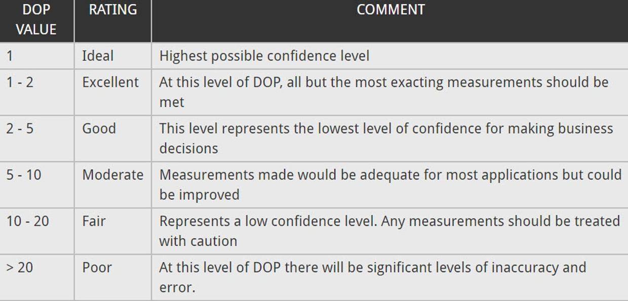 GDOP (geometric dilution of precision) or PDOP (position dilution of precision) describes error caused by the relative position of the GPS satellites. Basically, the more signals a GPS receiver can “see” (spread apart versus close together), the more precise it can be.